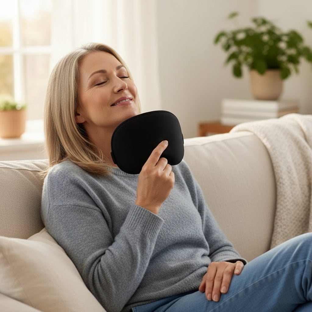 ThermoRelief’s next-gen heat therapy gently warms the sinus area to support natural drainage and calm the surrounding facial muscles — often tight from chronic congestion, poor sleep, and daily stress.